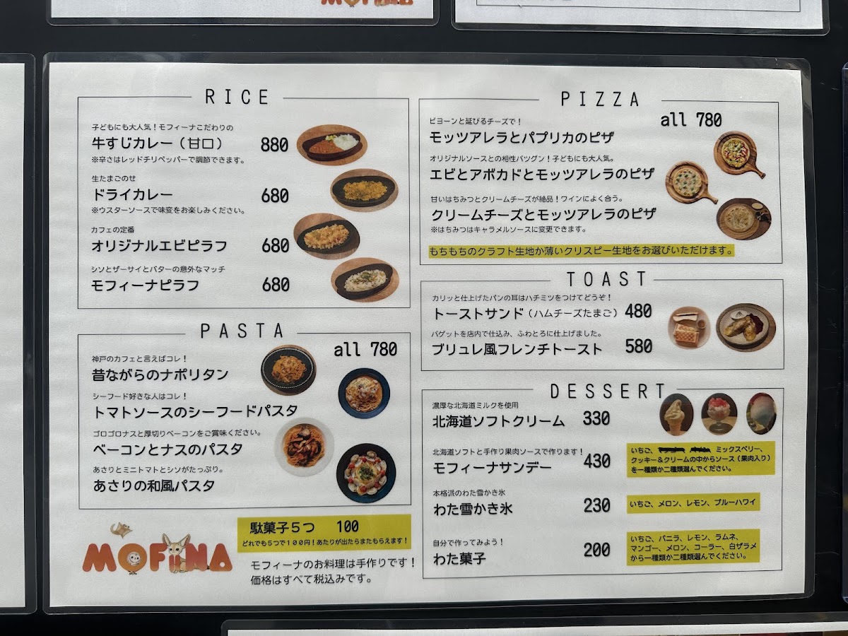 Welcome to MOFiiNA, a delightful café located in Kobe, Japan, where animal lovers and food enthusiasts can indulge in a unique experience. At MOFiiNA, the menu features an enticing array of beverages perfectly crafted to complement your visit. Start with a comforting Blended Coffee (HOT/ICE) for just JP¥495 or savor the delightful Wiener Coffee (HOT) at JP¥517. For a refreshing twist, try the Strawberry Shake made with homemade fruit sauce at JP¥605, or enjoy a fruity Strawberry Banana Smoothie for the same price.